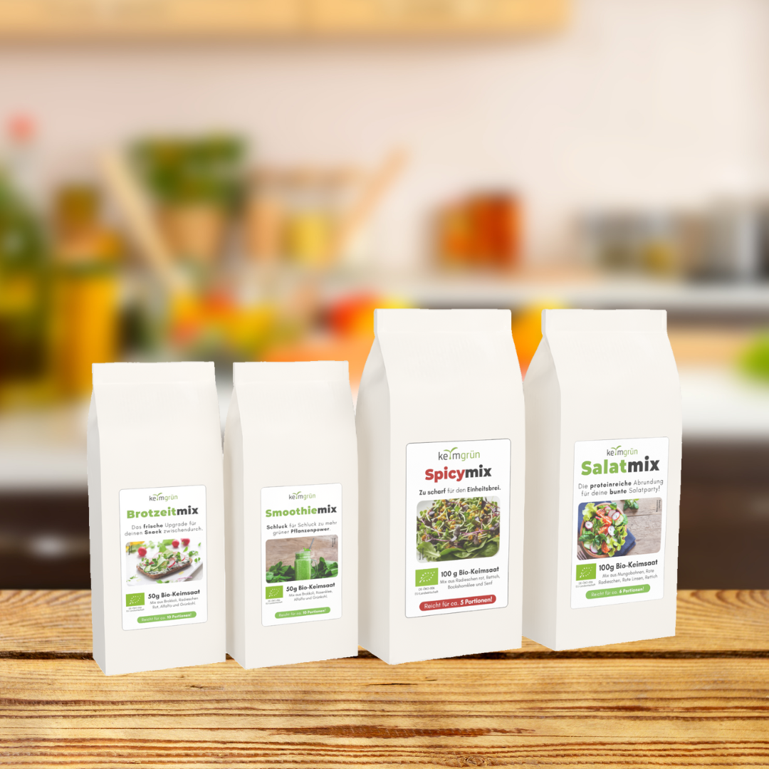 Mit unserem Keimgrün Sprossenmix Probierpaket entdeckst du vier unserer beliebtesten Sprossenmixe. Perfekt abgestimmt in Geschmack und Keimdauer, bringen sie Abwechslung in deinen Alltag – von Brotzeit über Salat bis zum Frühstück und Smoothie!