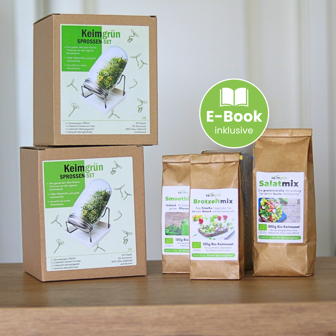 Die fertig gekeimten Mixe kannst du nach Belieben in dein Müsli, deinen Salat, deinen Smoothie oder aufs Brot machen. Du bekommst von uns im E-Book außerdem einfache Verwendungsideen, die du ganz bequem in deinen bestehenden Alltag einbauen kannst.